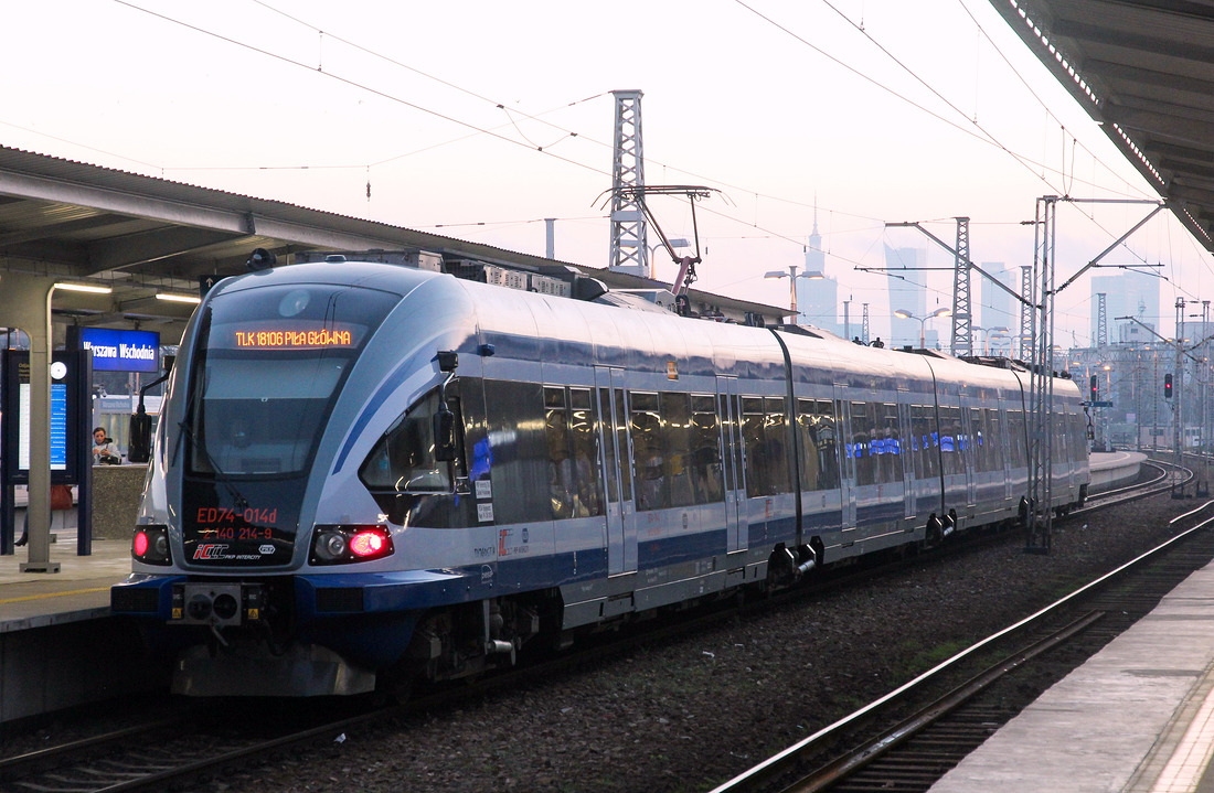 PKP Intercity ED 74-014 als TLK 18106 von Terespol nach Pila Glowna. Fotografiert am 7. Dezember 2015 im Bahnhof Warszawa Wschodnia.
