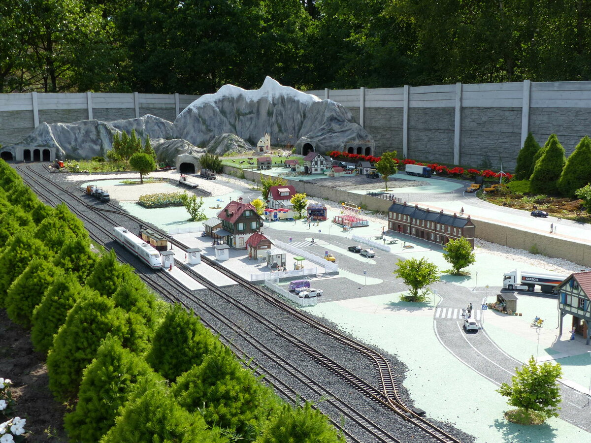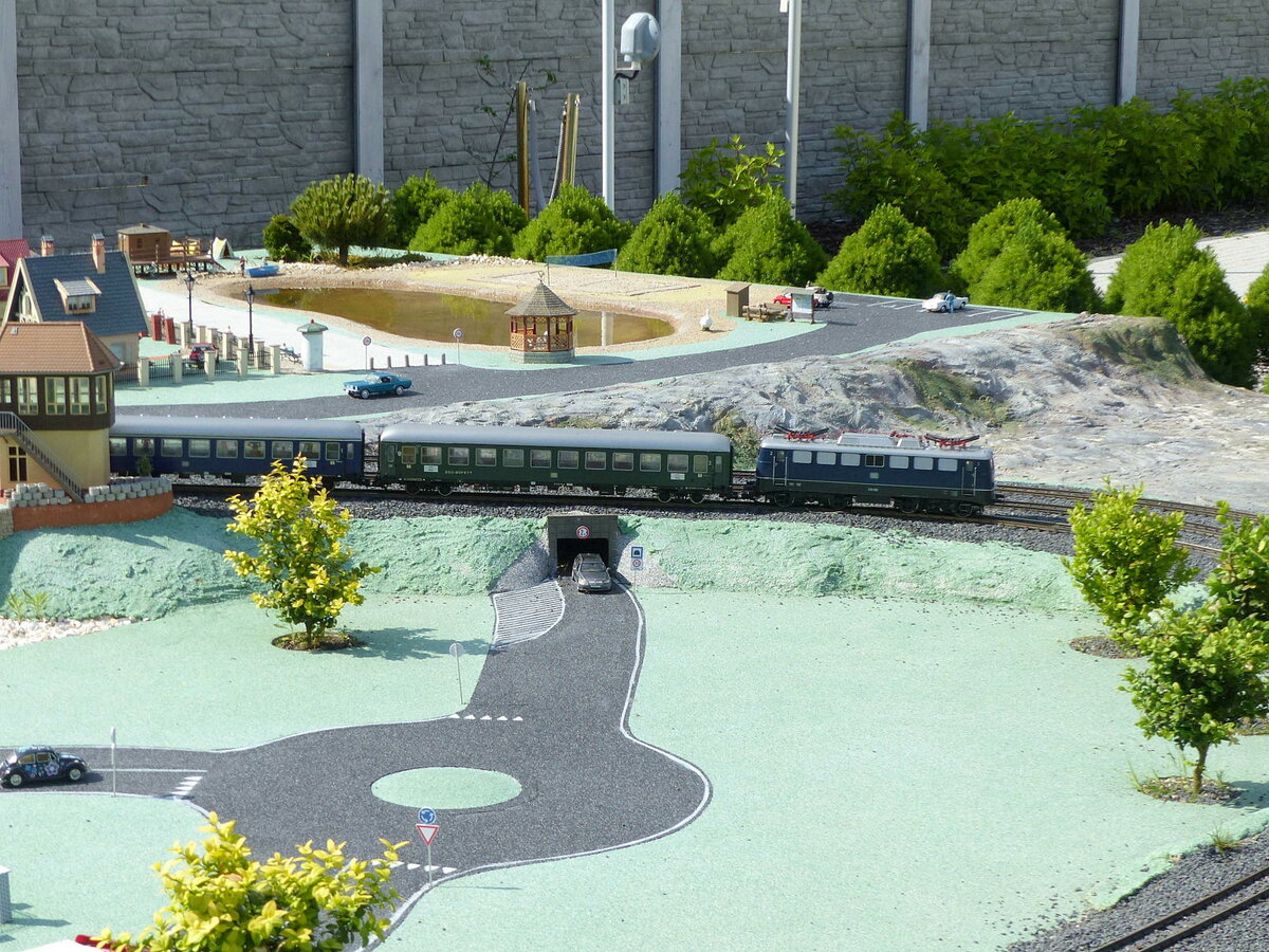 Eine E10 mit Personenzug, sowie ein dampflokbespannter Zug und ein LCE, am 10.06.2017 im Bałtycki Park Miniatur in Miedzyzdroje.