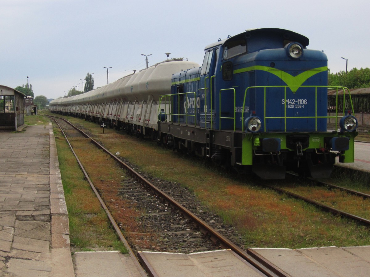 SM42-1106 mit Zementwagen in Bahnhof Miedzyrzecz, 09.05.2015