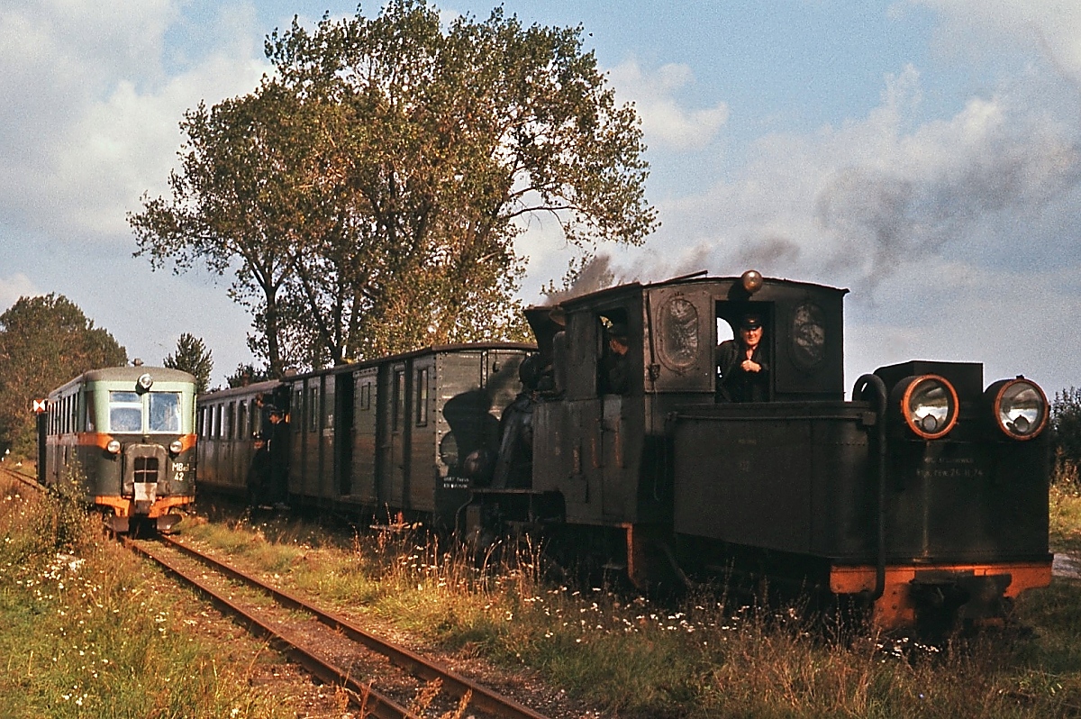 Schmalspurbahnen in Polen: Auf ihrer Fahrt von Sucha nach Witaszyce/Witaschütz passiert die Ty3 194 am 25.09.1976 einen Teich (leider ohne Spiegelung)