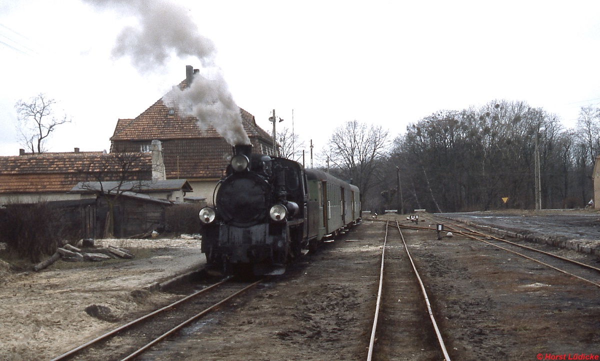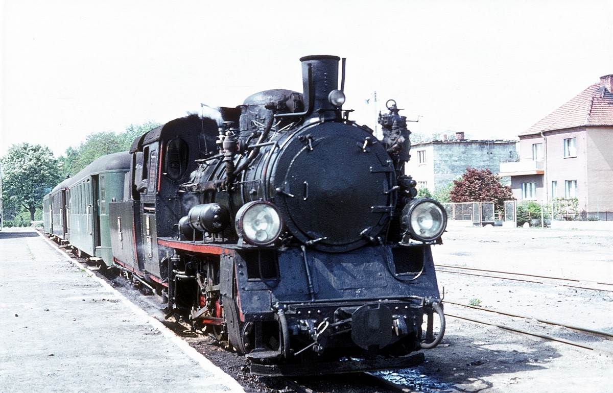 An einem trüben Februartag 1989 wartet eine Px 48 im Bahnhof Zaniemysl auf die Abfahrt nach Sroda. Diese 750 mm-Schmalspurbahn gehörte zu den letzten mit Dampflokomotiven betriebenen polnischen Schmalspurbahnen. Bis 1978 führt die Strecke weiter bis kurz vor Poznan.