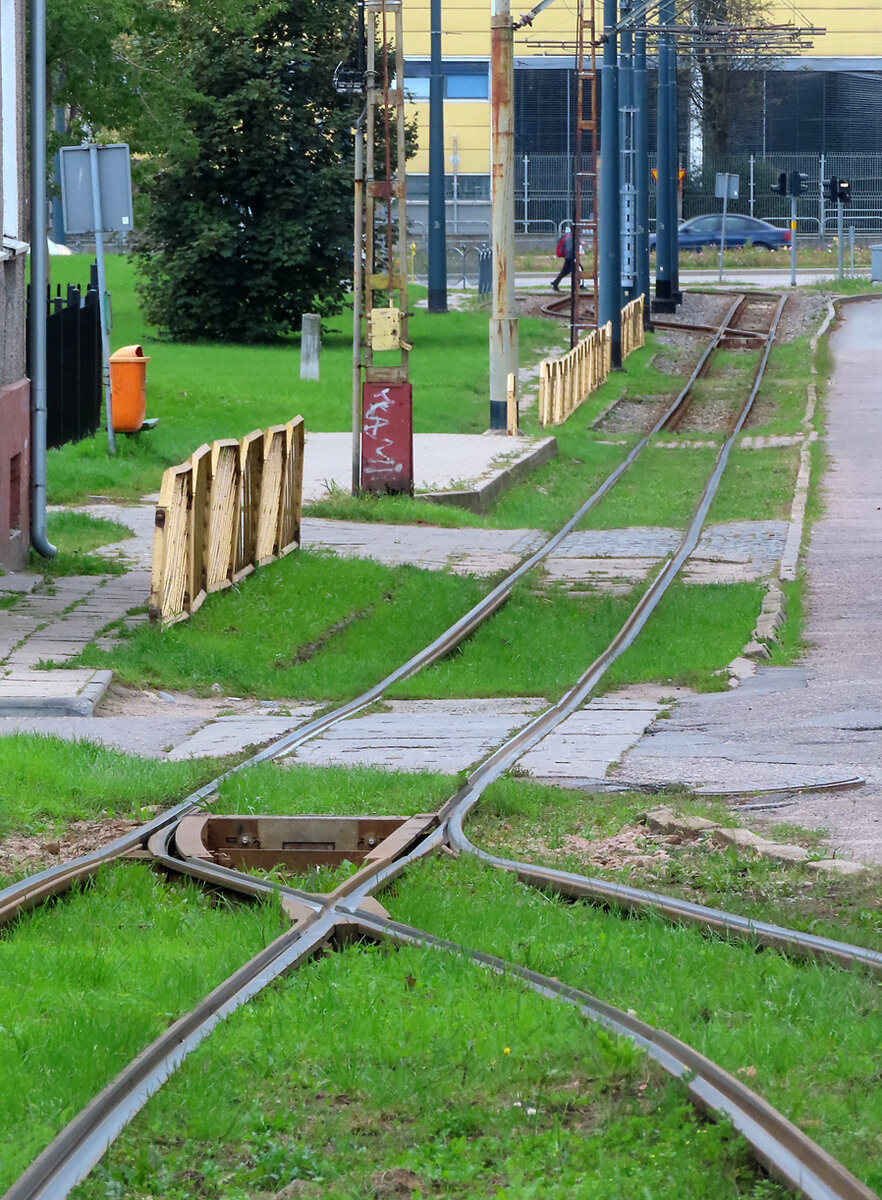 Einspuriger Abschnitt im Netz der Strassenbahn Elblag. Das Foto wurde von einem kleinen Bahnübergang aufgenommen. Elblag (Elbing), 22.9.2021 Markus Gmür