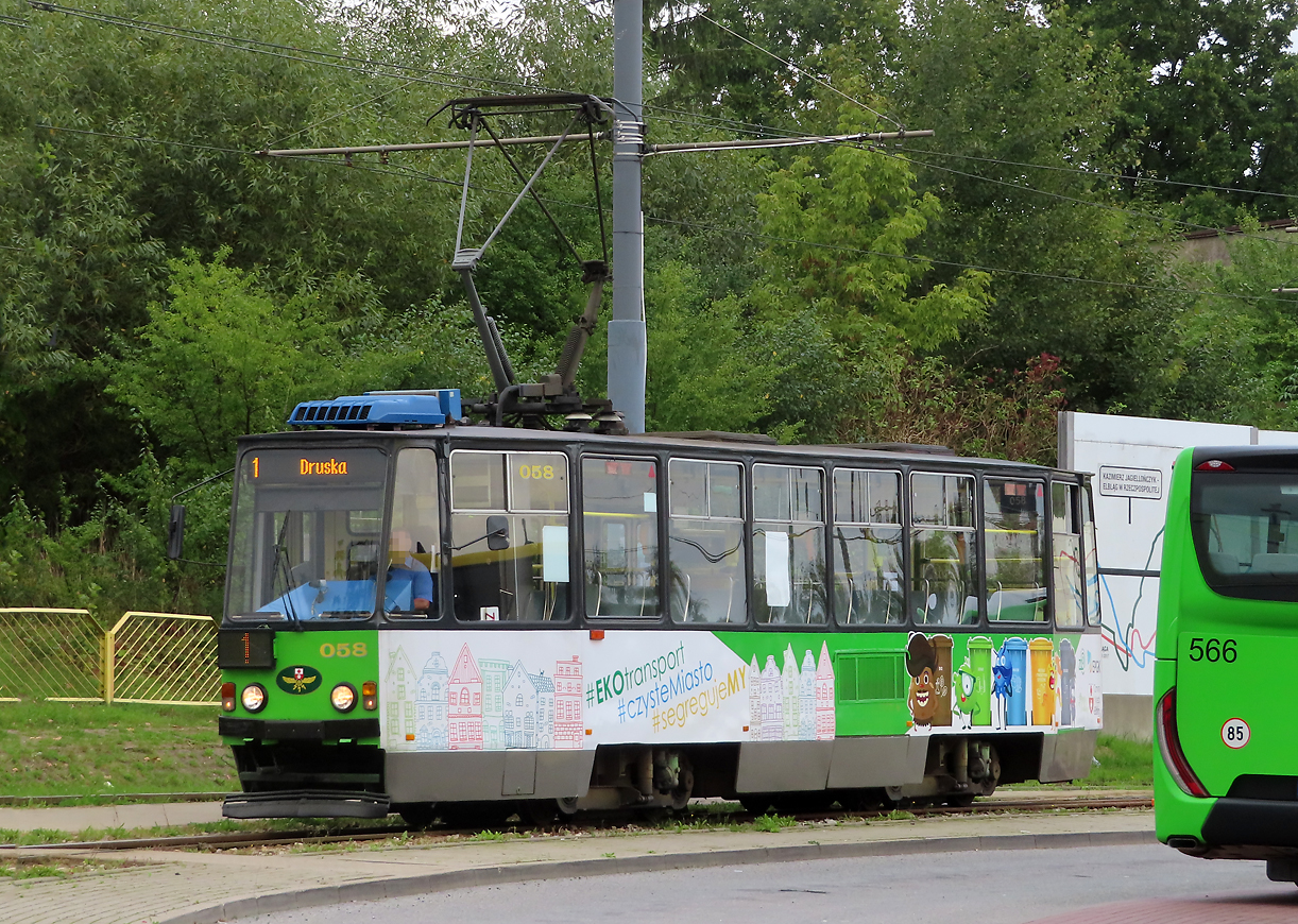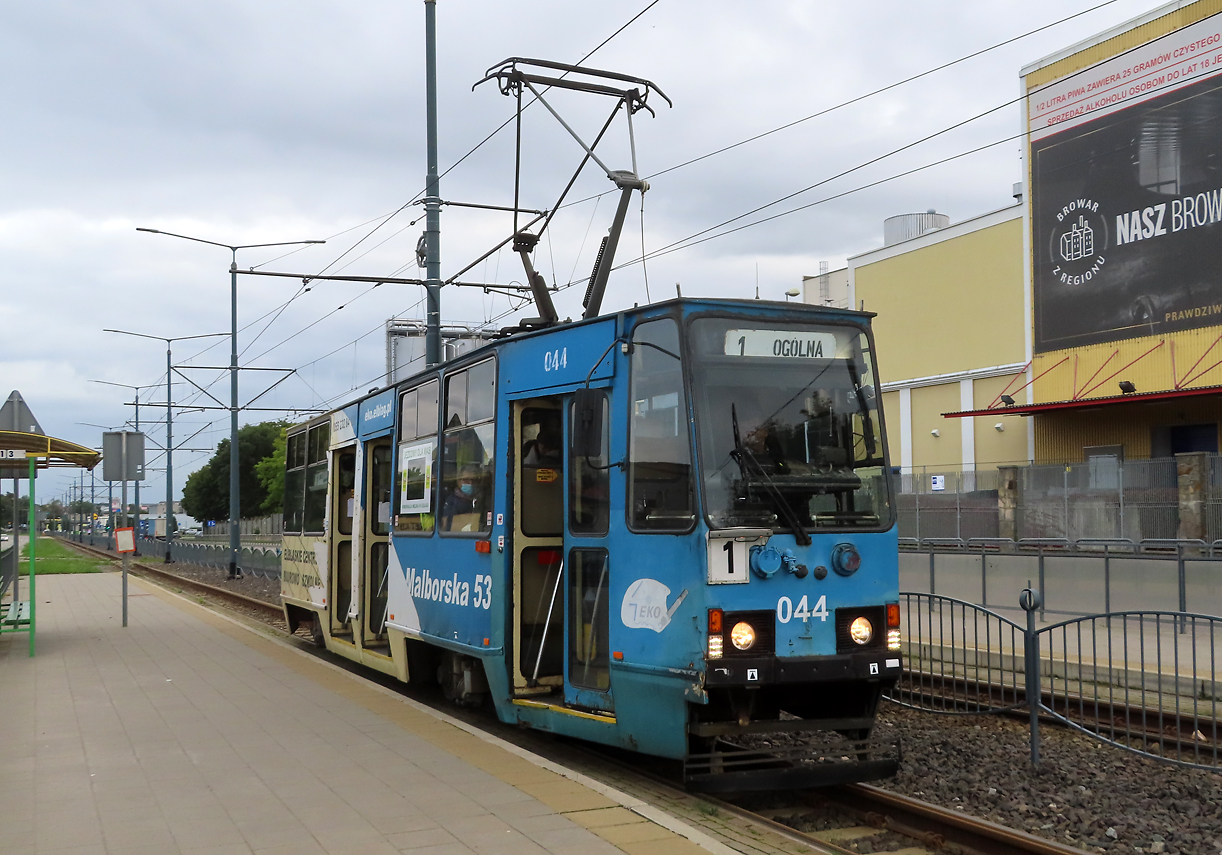 Strassenbahn der Linie 3 unterwegs auf einem einspurigen Abschnitt im Netz der Strassenbahn Elblag. Das Gleis verläuft vor dem Fotografen in einer Kurve. Elblag (Elbing), 22.9.2021 Markus Gmür