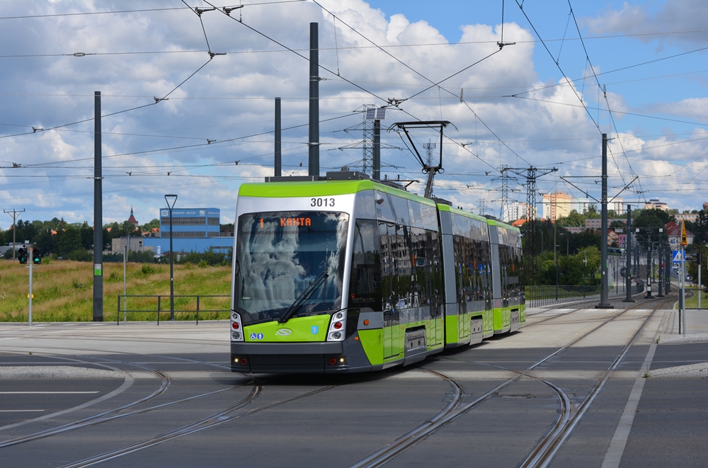 20.07.2016, Olsztyn (Allenstein), Aleja Generała Władysława Sikorskiego, Solaris Tramino S111O #3013 erreicht die Haltestelle Galeria Warmińska.