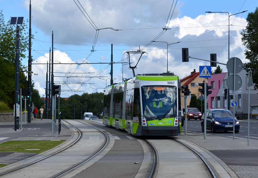 20.07.2016, Olsztyn (Allenstein), Aleja Generała Władysława Sikorskiego. Solaris Tramino S111O #3007 verlässt die Haltestelle Dywizjonu 303 und fährt weiter nach Dworzec Główny (Hauptbahnhof).