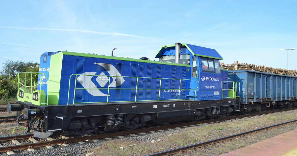 PKP Cargo mit ihrer "SM42-1227 6Dg" (NVR: "92 51 3 620 142-1 PL-PKPC") rangiert einen Ganzzug Hochbordwagen zum Abstellgelände neben dem Bahnhof Kostrzyn nad Odrą (oben), 05.09.23