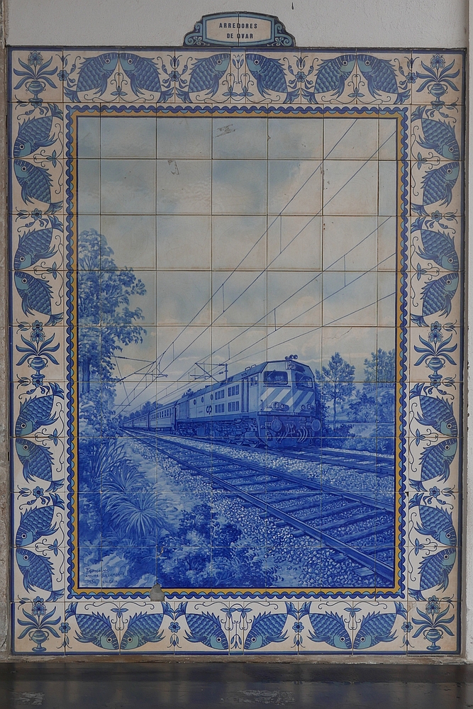 Eine Wandseite des Bahnhofgebäudes von Ovar ist mit mehreren Bildern, die aus bemalten Keramikfliesen hergestellt wurden, sogenannten Azulejos verziert. Ein Azulejo mit der Bildüberschrift „Lokomotive des 20. Jahrhunderts“ (Locomotiva século XX) zeigt eine E-Lok der Baureihe 2600 und einen Bahnübergang (11.10.2017).