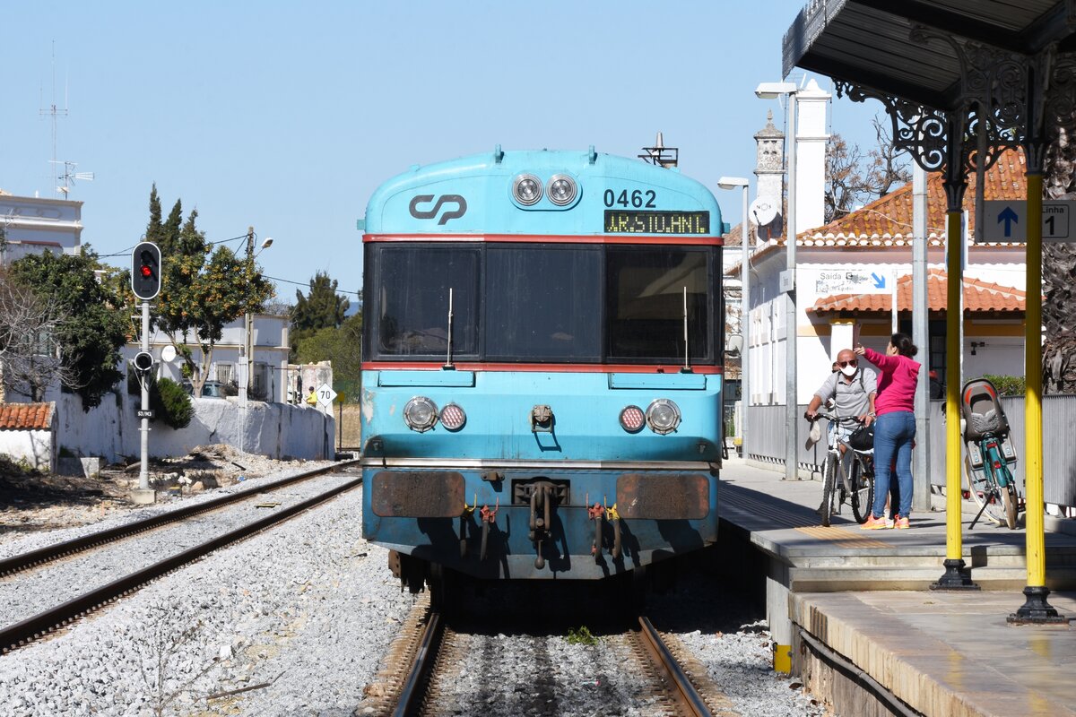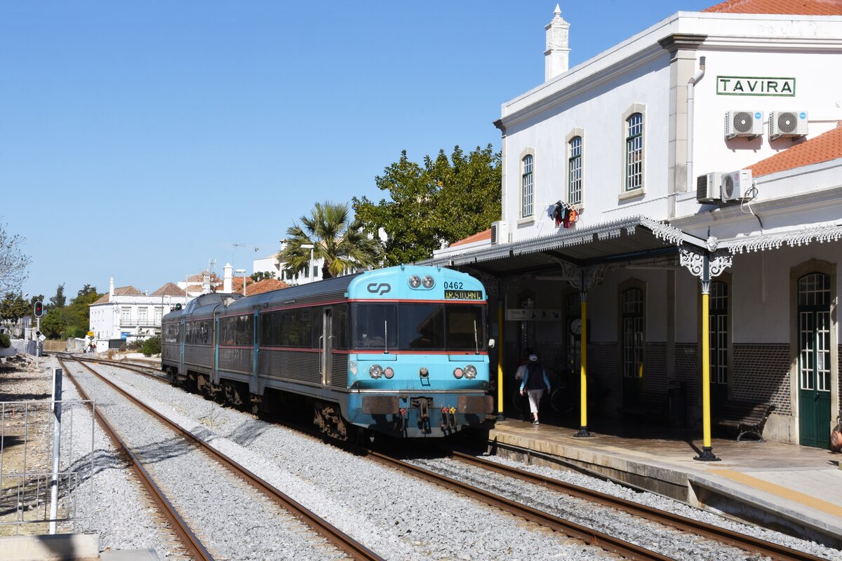 TAVIRA (Distrikt Faro), 19.02.2022, Zug Nr. 0462 als Regionalzug nach Vila Real de Santo António (das angegebene Zugziel ist falsch!) bei der Einfahrt in den Bahnhof Tavira