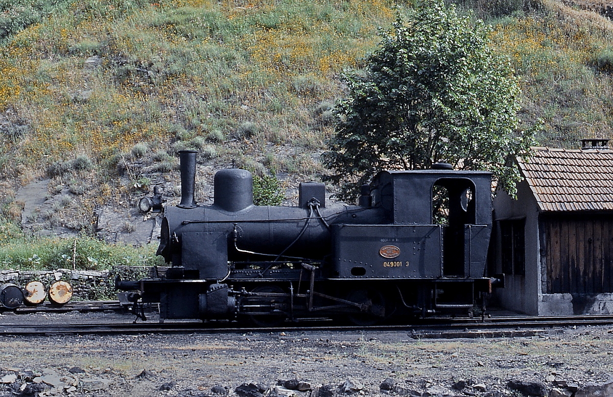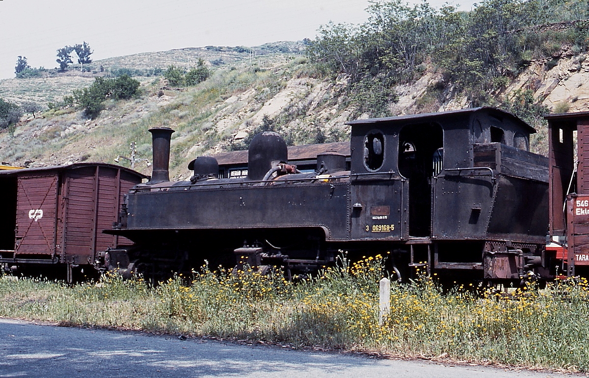 Schmalspurdampflokomotiven in Portugal: CP 3 059 056-4 am 27.04.1984 abgestellt in Tua. Die Lok gehört zu einer Serie von sechs Cn2t-Lokomotiven, die Emil Kessler/Esslingen 1889 an die Compania National de Caminhos de Ferro (dort Nr. 1-6, später CP E 51-56) lieferte.