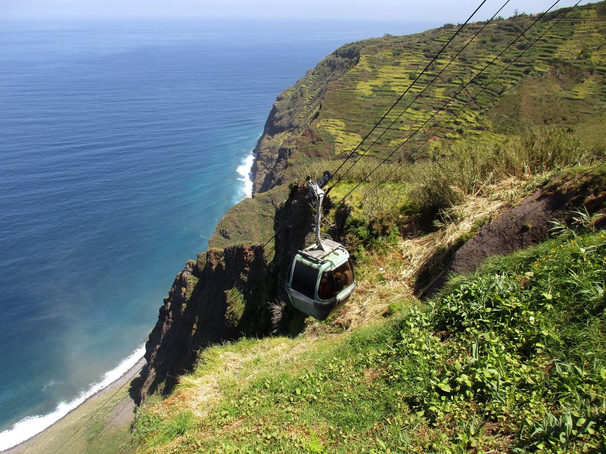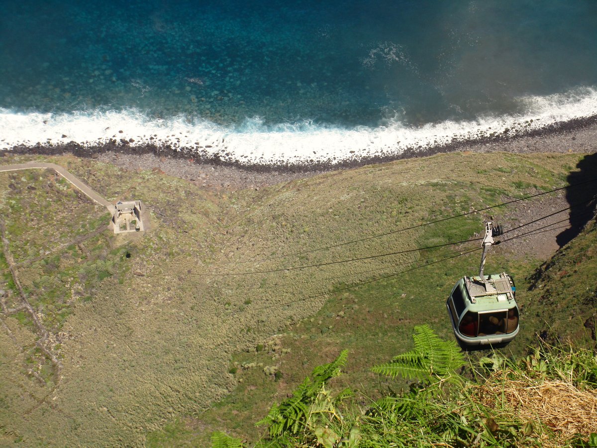 Begegnung beider Gondeln auf der extrem steilen Seilbahn von Achadas da Cruz, die nach unten zur Landzunge von der Insel Madeira unterhalb führt. Aufgenommen am 21. April 2017 während der 1. Fahrt nach der "Mittagspause" der Seilbahn. Die Seilbahn von Achadas da Chruz überwindet in wenigen Minuten kapp 480 Höhenmeter!