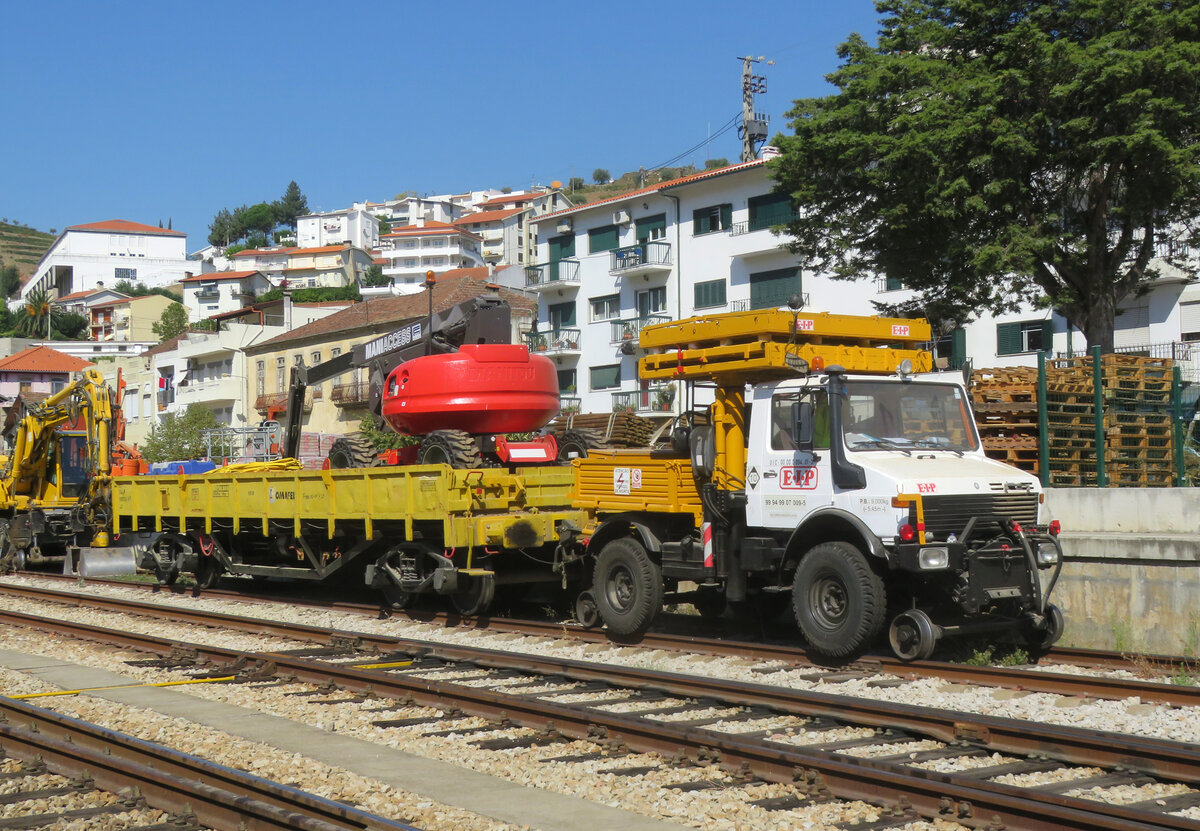 Auch im Dourotal müssen die Gleise unterhalten werden: Zweiwegfahrzeug mit Materialwagen in einem Unterwegsbahnhof. Dourotal, 28.09.2018