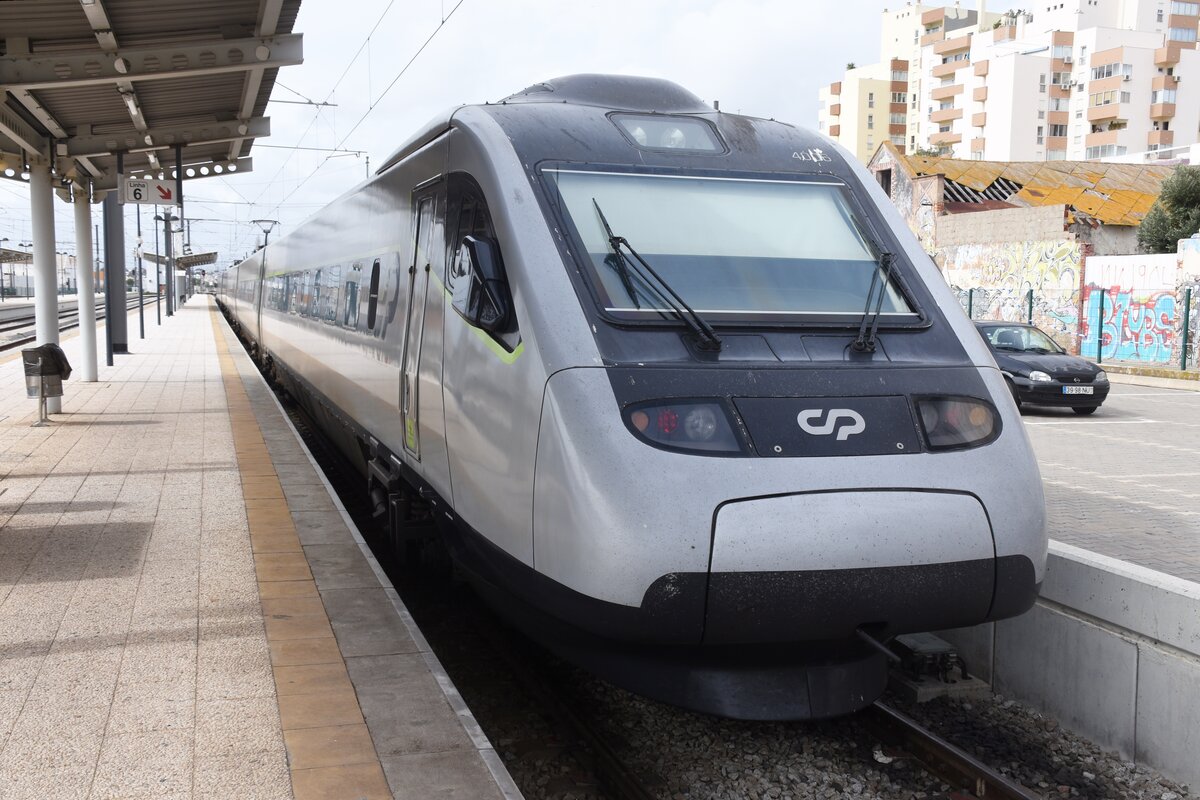 4005 als Alfa Pendular 186 von Porto Campanhã nach Faro fährt am 06.10.2017 in Aguda gleich an dem hinter einem Geländer eines Fußgängerbahnübergangs stehenden Fotografen vorbei.