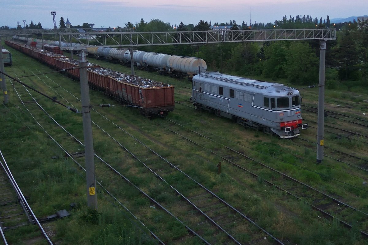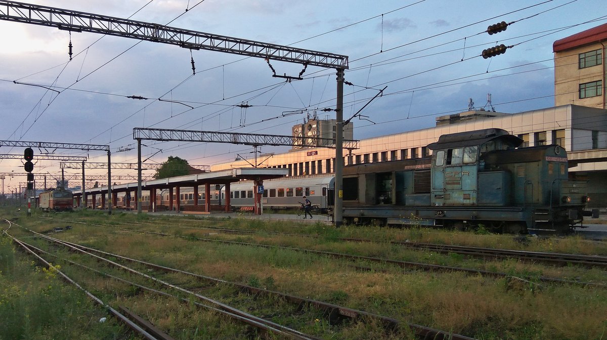 Panorama des Bahnhofs Bacau. Diesellok 92-53-0-80-0213-1 und E-Lok 91-53-0-474-044-1 manövriereen am Abend des 12.05.2017.