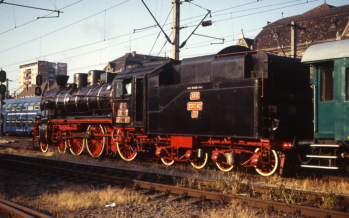 Von der Morgensonne beschienen: CFR 230 142 (Malaxa 55/1932) am 29.05.1995 im Bahnhof Arad. Bei der Lokomotive handelt es sich um einen Nachbau der preußischen P 8/Baureihe 38. Insgesamt standen bei der CFR 375 Lokomotiven dieser Baureihe im Dienst, die letzten wurden erst in den späten 1980er Jahren abgestellt.