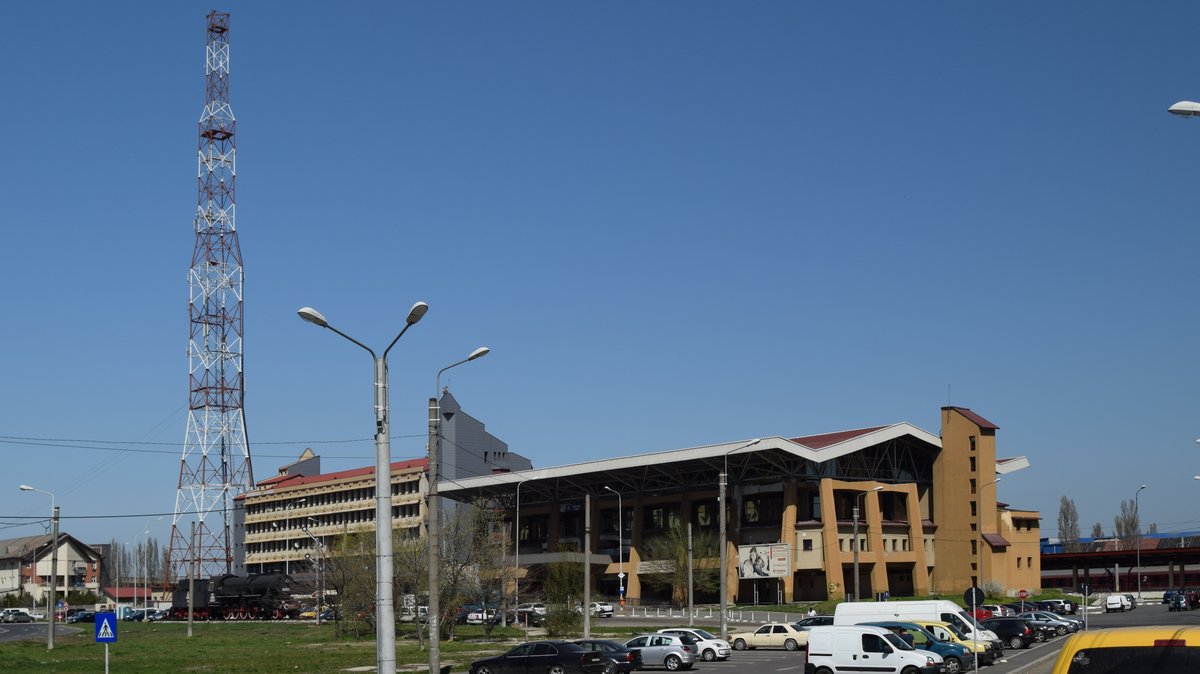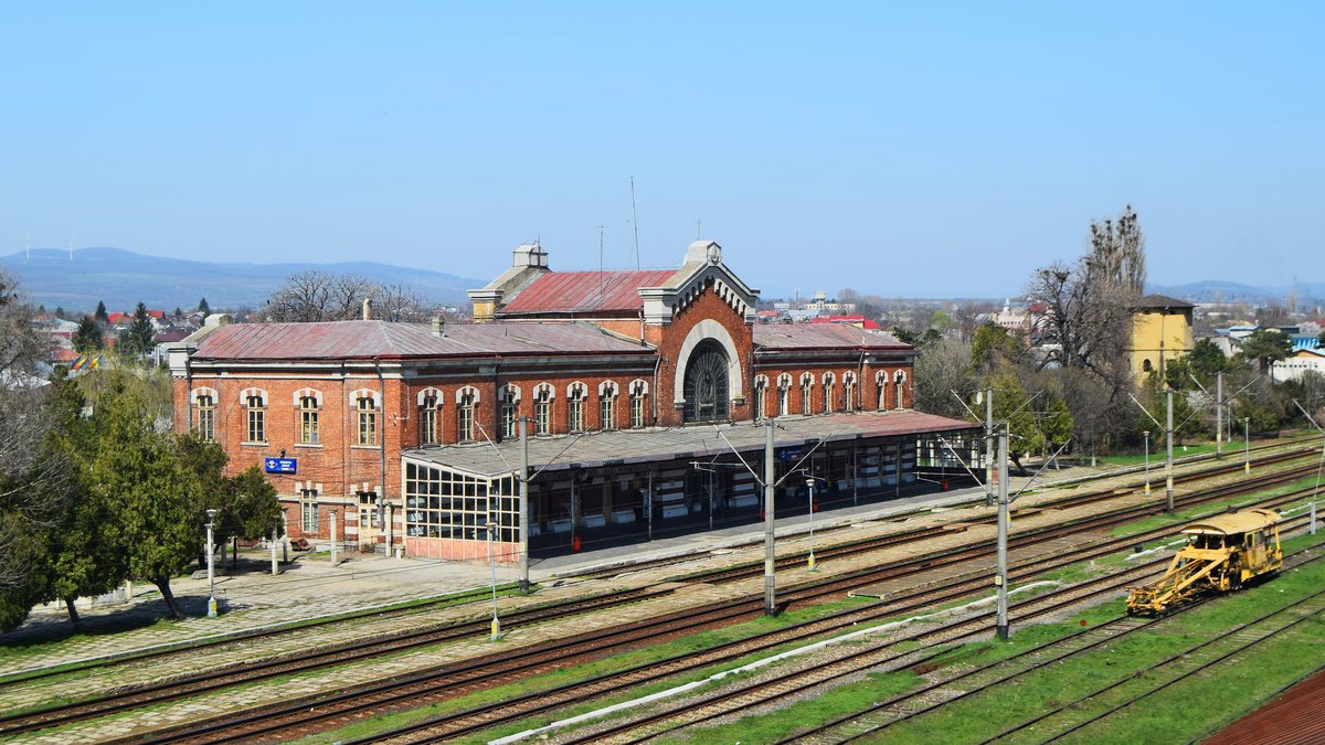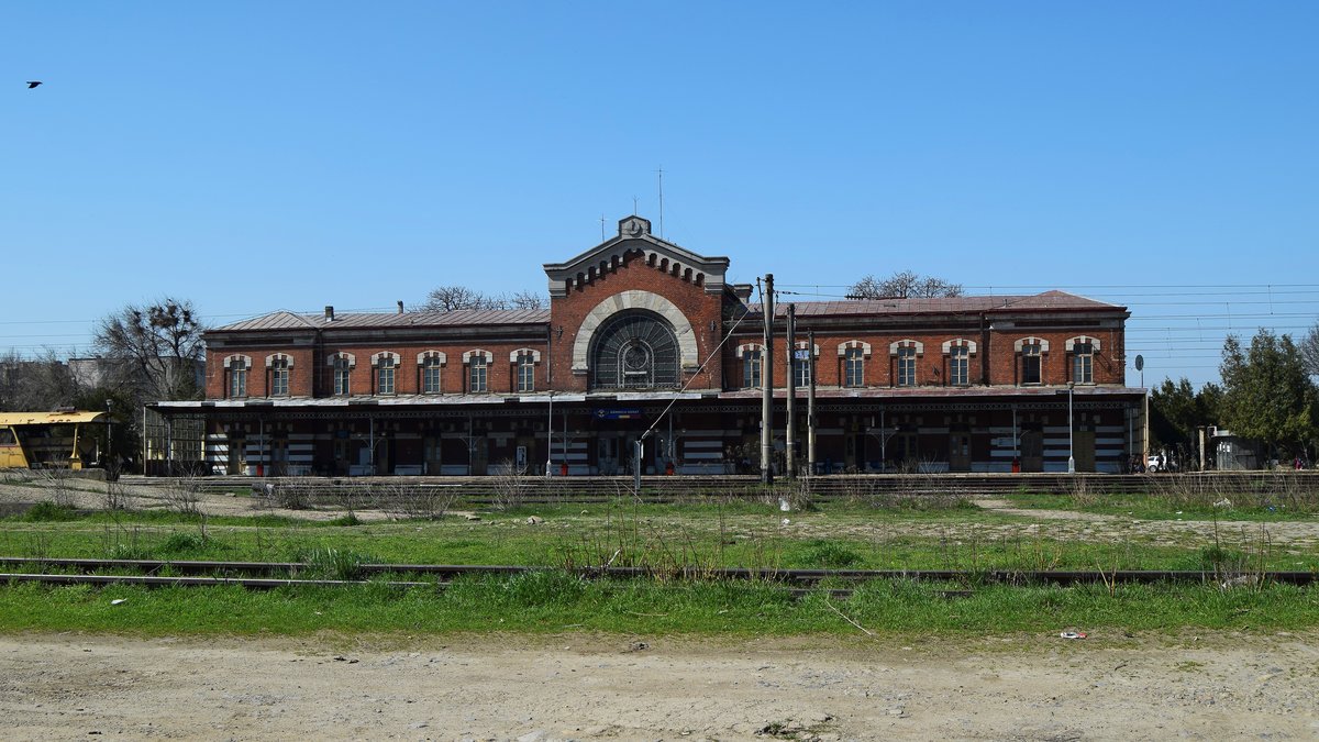 Empfangsgebäude des Bahnhofs Galati fotografiert vom Bahnhofsplatz am 09.04.2018