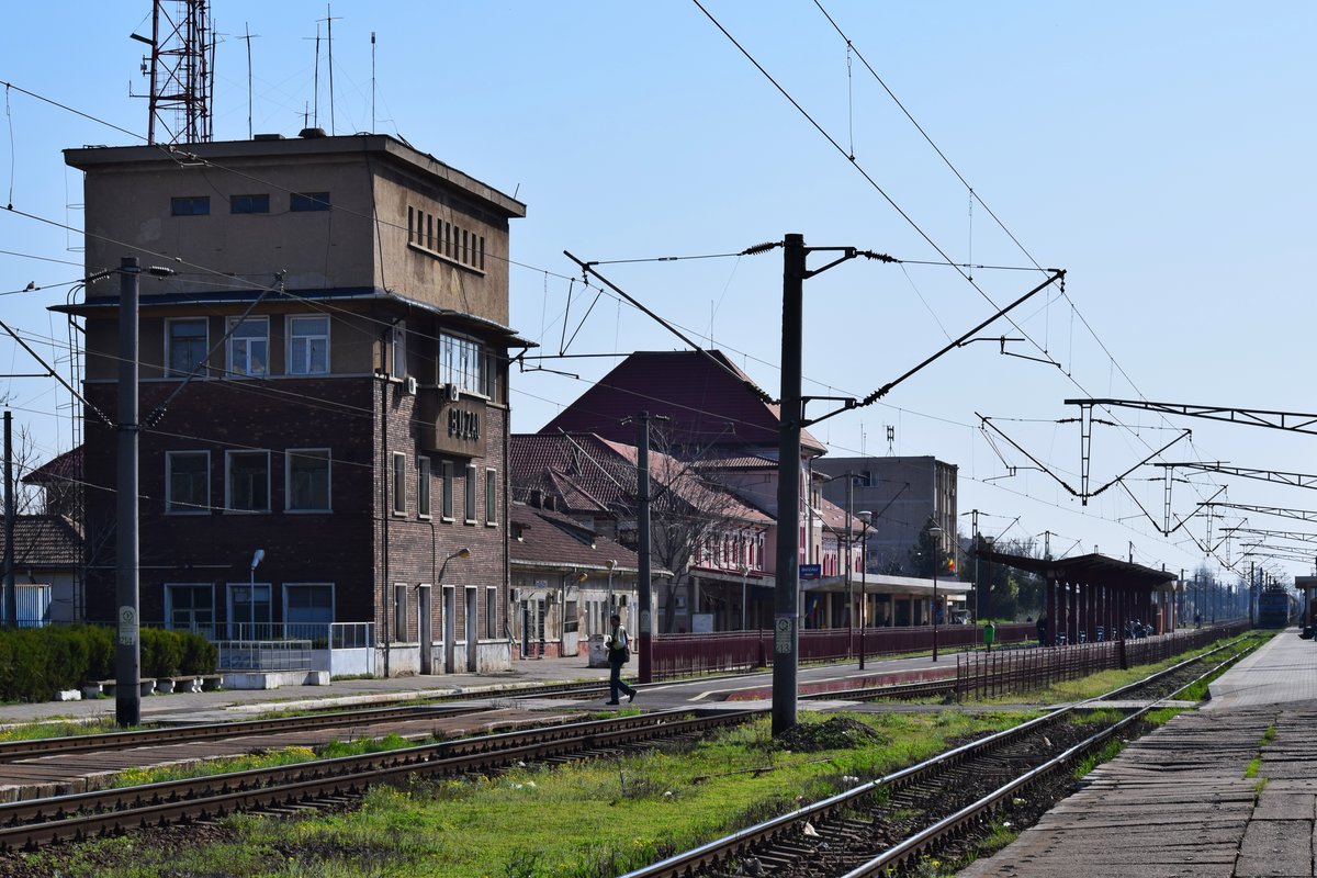 Empfangsgebäude de Bahnhofs Ramnicu Sarat am 09.04.2018, fotografieert von der anderen Bahnhofsseite.
