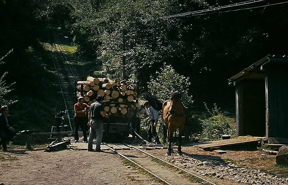 Die Waldbahn Covasna-Comandau bestand aus zwei Teilstrecken, von denen eine im Tal, die andere in rund 1.000 m Seehöhe auf einer Hochebene lag. Verbunden waren die beiden Teilstücke durch eine Standseilbahn, die einen Höhenunterschied von 327 m überwand und mit der die beladenen Holzwagen ins Tal befördert wurden. Hier die Bergstation der Standseilbahn im Sommer 1992. (Anmerkung: Die Bahnanlagen sind größtenteils zurückgebaut und auf Google Maps nicht mehr zu erkennen. Die Ortsangaben sind daher nur als ein ungefährer Annäherungspunkt zu verstehen)