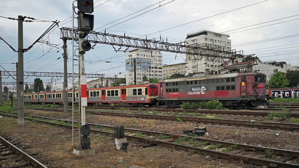 E-Lok 45-0397-5 zieht am 21.08.2016 mit IR aus Mangalia am Schwrzen Meer in Richtung Satu Mare an Gleis 1 des Bahnhofs Bucuresti Baneasa ein.