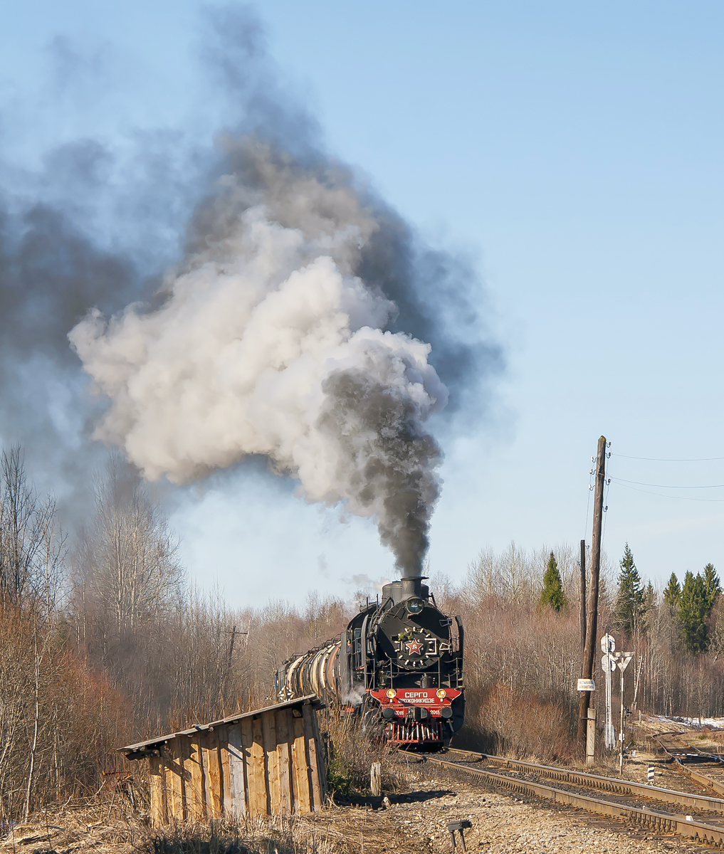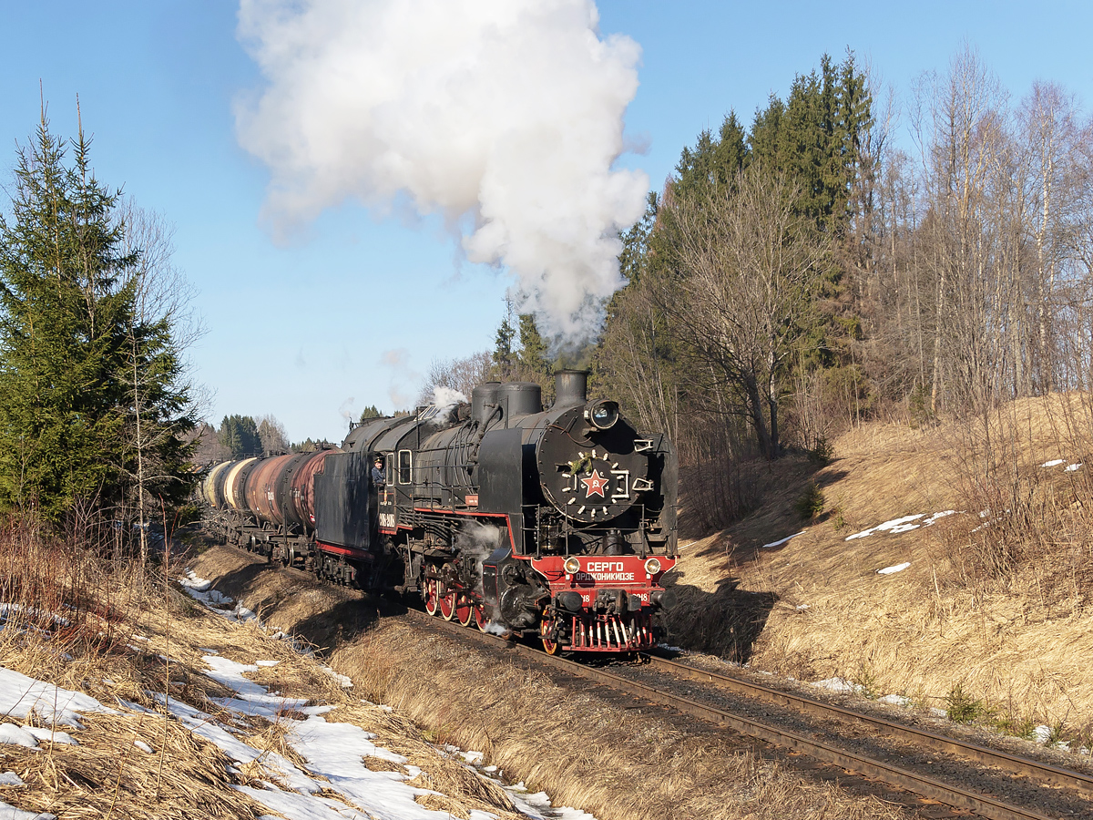 Die Dampflok SO18-2018 mit Sonderzug bei Scheinanfahrt zwischen Bahnhöfe Owinishche 1. und Ostolopowo am 25. März 2007.