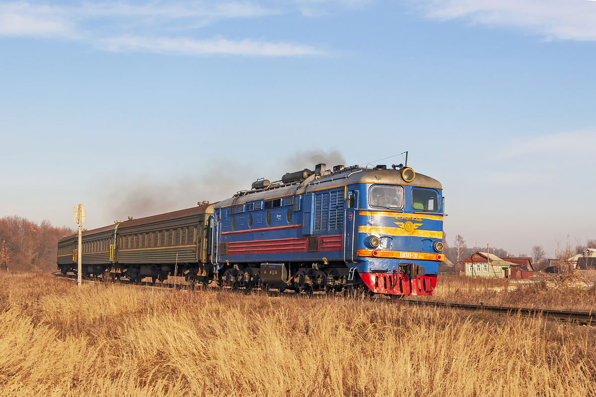 Die Diesellok TEP10-311 mit einem Nahverkehrszug zwischen Bahnhöfe Seliwanovo und Bezlesnaja, Gebiet Wladimir am 5. November 2005.