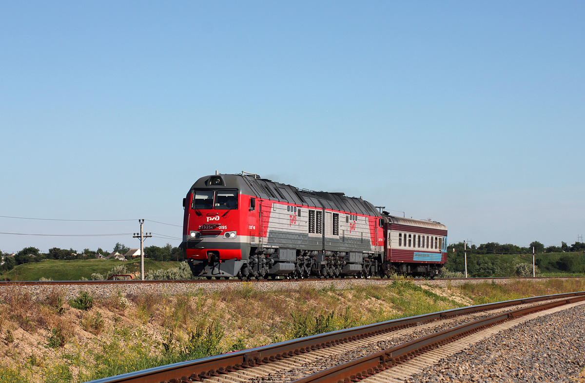 Тепловоз 2ТЭ25КМ-0109 с грузовым поездом выходит со станции Красная Стрела, Северо-Кавказская Железная Дорога.