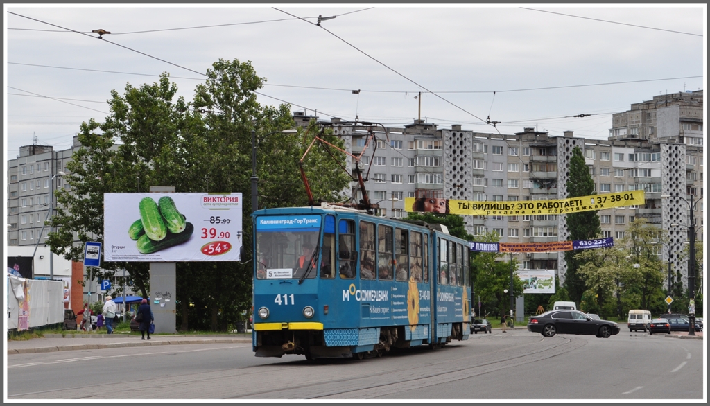Die Autos sind auch in Russland mehrheitlich westlich, nur die Strassenbahn ist ausschliesslich tschechisch. CKD Tatra Wagen 408 der Linie 5 in Kaliningrad. (05.06.2012)