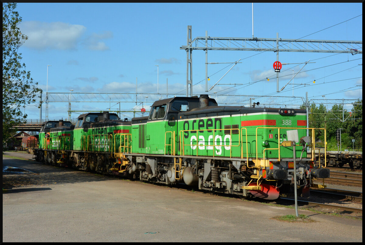 Wochenendruhe in Älmhult: Drei Rangierloks der Baureihe Littera Td (374, 388 & 389) von Green Cargo ruhen sich am 17.08.2024 nach getaner Arbeit auf einem Abstellgleis aus. Kurz zuvor waren die Maschinen aus dem rund 48 km entfernten Volvo-Werk in Olofström gekommen. Matthias Kümmel