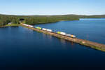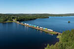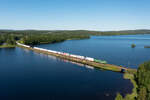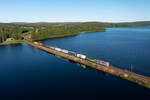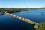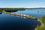Diese Situation dürfte wohl weltweit einzigartig sein: Der Bahnhof Örnsköldsvik überspannt im nördlichen Bahnsteigbereich über eine Brücke den Auslauf einer Skisprungschanze. 10.06.2018