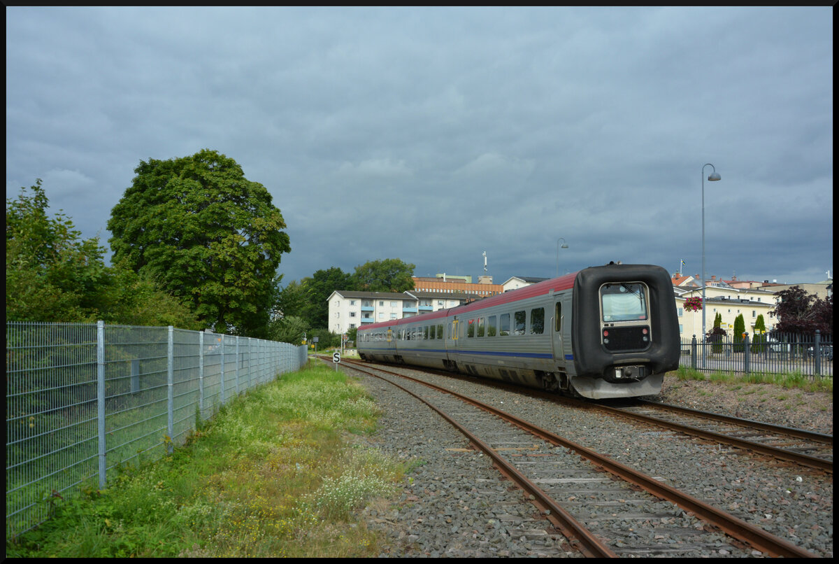 Full house in Hultsfred: Krösatågen Triebwagen Nr. 1384 beschleunigt am 23.08.2024 pünktlich um 10:04 Uhr nach Linköping von Gleis 3 aus dem Bahnhof der Kleinstadt. Zeitgleich entschwindet auf Gleis 2 der Krösatågen Triebwagen Nr. 1423 in Gegenrichtung nach Kalmar und auf Gleis 4 warten zwei Rangierlokomotiven der Baureihe Littera Td von Green Cargo auf weitere Aufgaben. Jetzt müsste nur noch ein alter Triebwagen auf dem Schmalspurgleis im Vordergrund stehen, dann würde der Titel auch voll zutreffen.