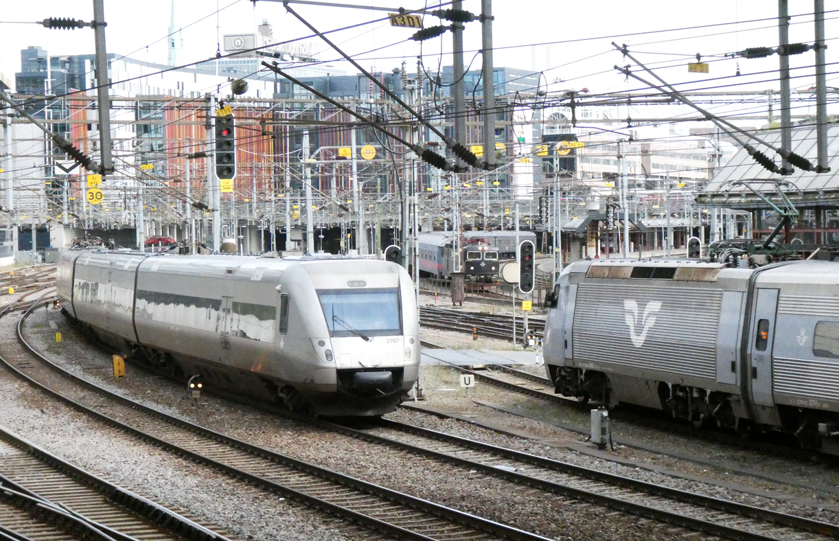 SJ 3000 (S-SJ 94 74 455 3345-0 X55A) bei der Einfahrt in den Bahnhof Stockholm Central am 21. Juni 2016.