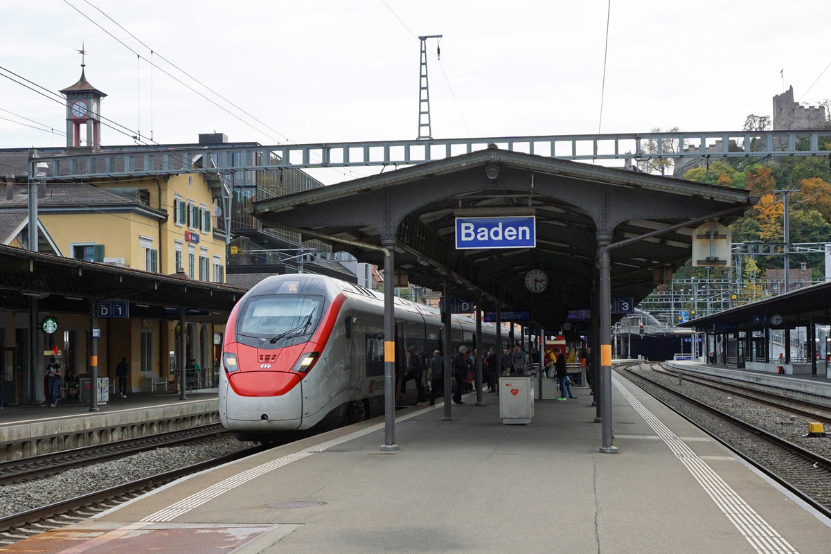 Die mit automatischer Kupplung ausgerüstete Re 420 280 durchfährt am 26. September 2018 mit einer Am 843 im Schlepp den Bahnhof Baden.