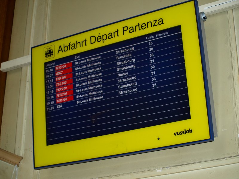 Die hochmoderne Zugzielanzeige im Wartesaal des Bahnhofs "Basel SNCF" am 6. Juli 2008. Krasser kann man alt und neu nicht zusammenbringen als diese LCD-Anzeige neben dem verlassenen Kiosk.
