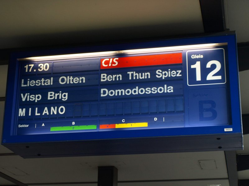 Die Zugzielanzeige im Bahnhof Basel SBB für einen Cisalpino nach Milano Centrale am 6. Juli 2008.