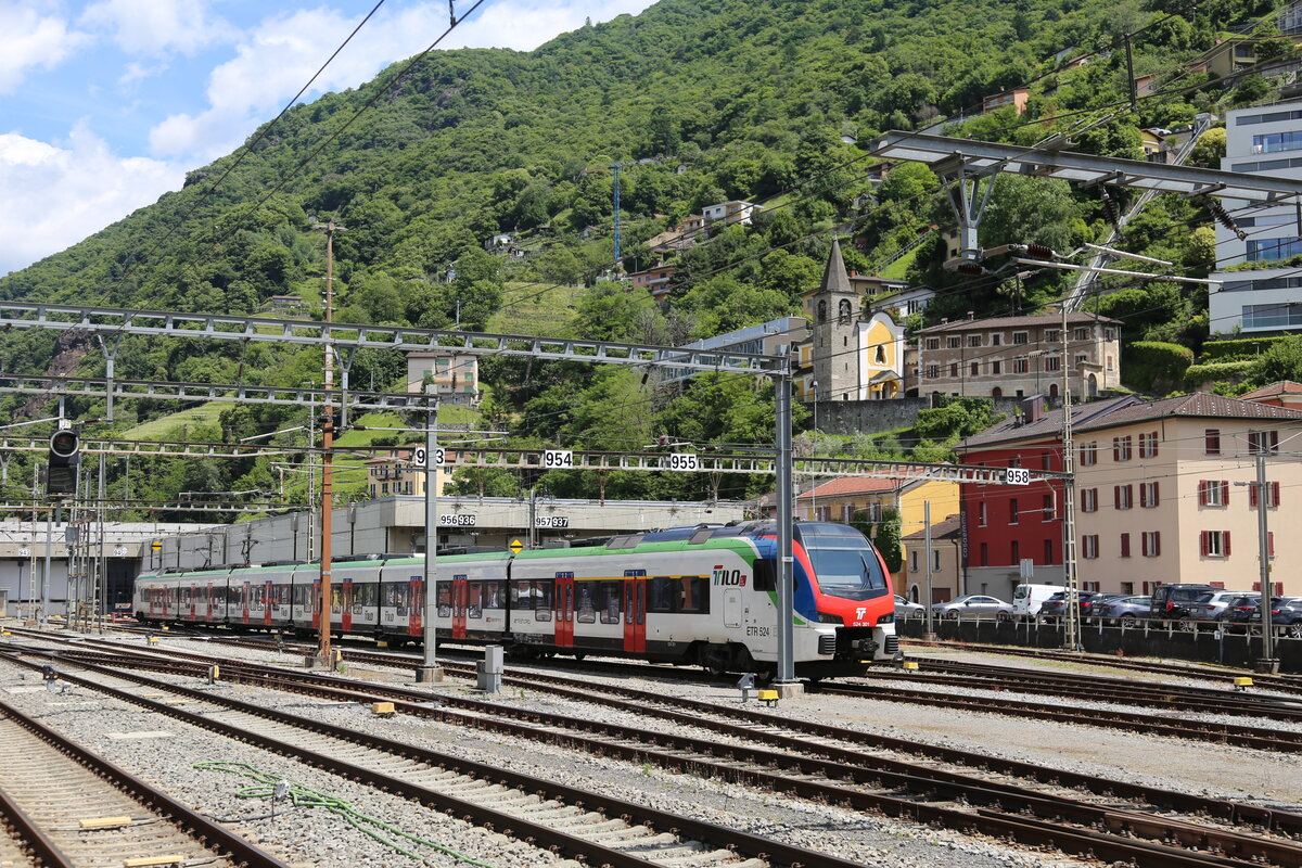 ET 524017 TILO fährt hier am 24.05.2025 12.53 Uhr aus Richtung Gotthard kommend in den Hauptbahnhof von Bellinzona ein.