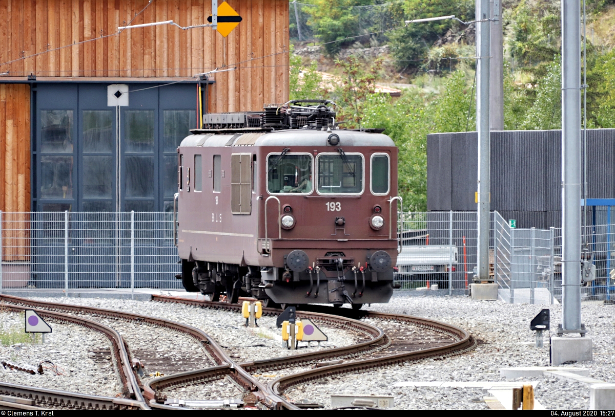 Re 4/4 193 (425 193-0) "Steg" ist im Bahnhof Brig (CH) auf Gleis 954 abgestellt.