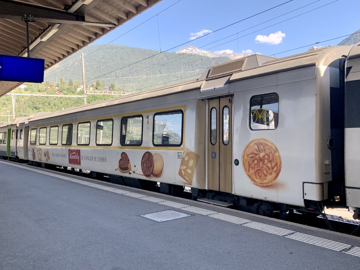 Der zweit letzte EW III Wagen mit der Kambly Beklebung - A 50 85 18-34 002-3 im Extrazug von Domo, am 20.7.21 im Bahnhof Brig.