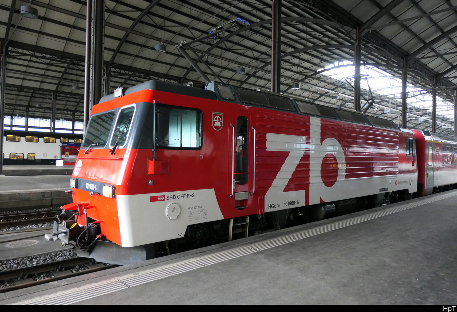 460 028 machte im Jahr 2016 Werbung für das Zugteam der SBB. Hier verlässt sie den Bahnhof von Luzern am 02.09.2016 mit IR 2648 nach Zürich Flughafen.