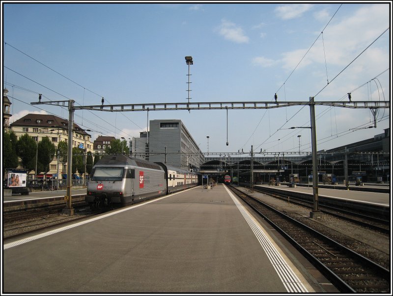 Mittwoch den 10.09.2025 um 13:26 Uhr in Luzern. Im Bahnhof Luzern auf Gleis 6 wird soeben der Extrazug 31353 welcher von der Abstellgruppe (Gleis 301) gekommen ist, für die Abfahrt bereitgestellt. Er befährt folgende Strecke: Luzern (ab 13:28 Uhr) über Meggen - Arth-Goldau – Biberbrugg – Pfäffikon (SZ) – Rapperswil (SG) – Wattwil (SG) – Herisau (AR) nach St. Gallen (an 17:22 Uhr). Formation des Zuges; Lokomotive: Re 421, UIC-Nr. 91 85 4421 387-2 CH-IRSI mit der Ursprünglichen Bezeichnung: Re 4/4 II 11387. An der Front unterhalb des Schweizerkreuzes fehlt momentan die Loknummer (11387), 1. Wagen: ARmz 61 85 8890 200-6 CH-IRSI (Voiture Salon - Restaurant No. 1071) mit der Anschrift "Le Salon Bleu“. Es ist ein Wagen des "Prestige Continental Express“ (Croisières Ferroviaires Européennes), 2. Wagen: WRm 61 85 8894 003-0 CH-IRSI (Piano-Bar No. 1073) mit der Anschrift "Le Diamant Bar“. Es ist ein Wagen des "Prestige Continental Express“ (Croisières Ferroviaires Européennes). Für diejenigen die alles sehen, noch eine Bemerkung, der Kupplungsbügel wird vor der Abfahrt noch in den Zughaken gelegt. An den Zugzielanzeigen in den Bahnhöfen wurde folgender Text angezeigt: "Commissaires des cuisines scolaires" zu deutsch etwa "Schulküchenkommissare“. Es ist eine Charterfahrt (TR Trans Rail – ZRT Bahnreisen). Der Name des pflichtbewussten Lokführers ist mir bekannt. Koordinaten GMS (Grad, Minuten, Sekunden): N 47° 2’ 57.5’’ O 8° 18’ 36.7’’ Erwin Lustenberger