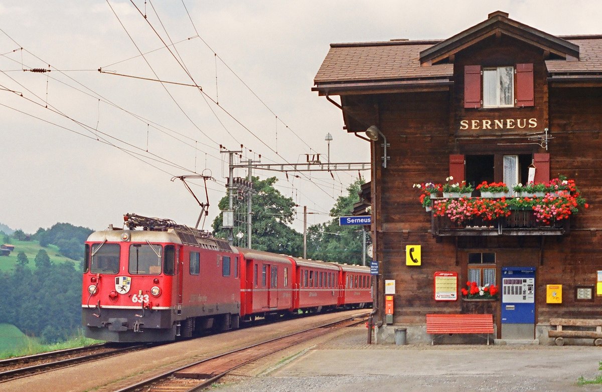 04.08.1991 Bahnhof Serneus der RhB, Zug mit Lok 633  Zuoz , die letzte der Baureihe 4/4 II.