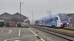 Wasserstoffzug von Stadler Rail für den Einsatz in Kalifornien am 14.02.2023 in Ramsen. Foto: Reinhard Bolle (Genehmigung zur Veröffentlichung liegt vor). Laut "rheintaler.ch" werden noch bis Mai mit dem Flirt H2 Testfahrten auf der stillgelegten Bahnstrecke zwischen Ramsen und Hemishofen durchgeführt.