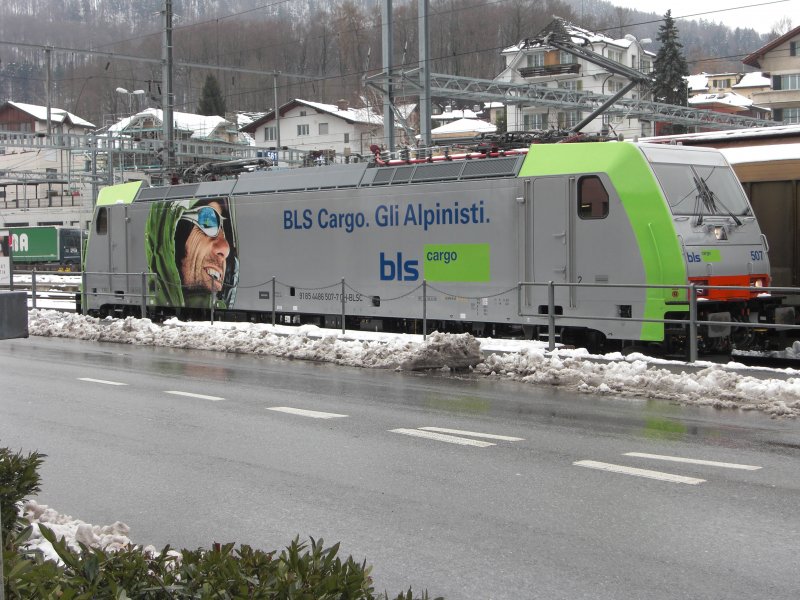Die brandneue Br 486 505-1 der BLS Cargo (Alpinist) steht im Bahnhof Spiez am 23.02.2009