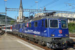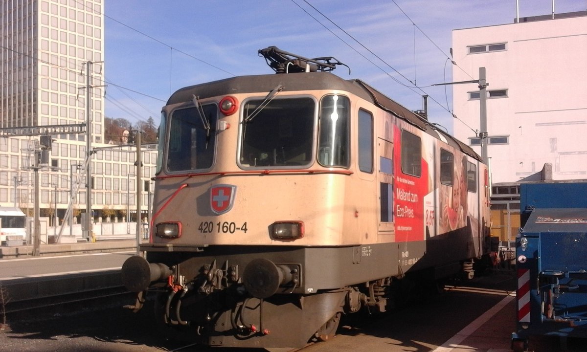 Die Re 420 160 (11160) ist mit einer Werbefolie ausgestattet worden. Hier sonnt sie sich in St. Gallen HB und hat bis Montag Standzeit.