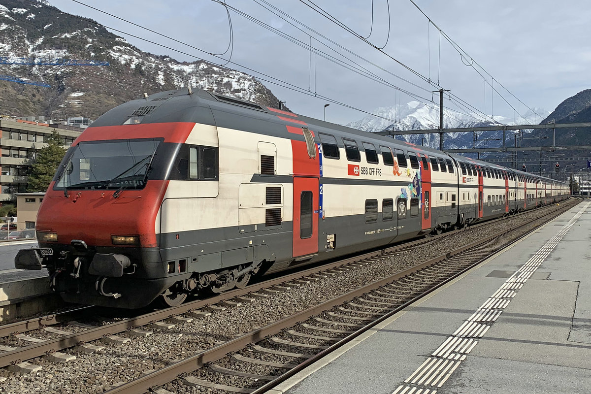 Die Re 460 117  Zürichsee  mit einem Dosto / EW IV Pendel am 23.1.25 im Bahnhof Visp. In die EW IV Pendel wurden je ein B und AS Dosto eingerieht um den Behindertengerechten Einstieg zu gewährleisten.