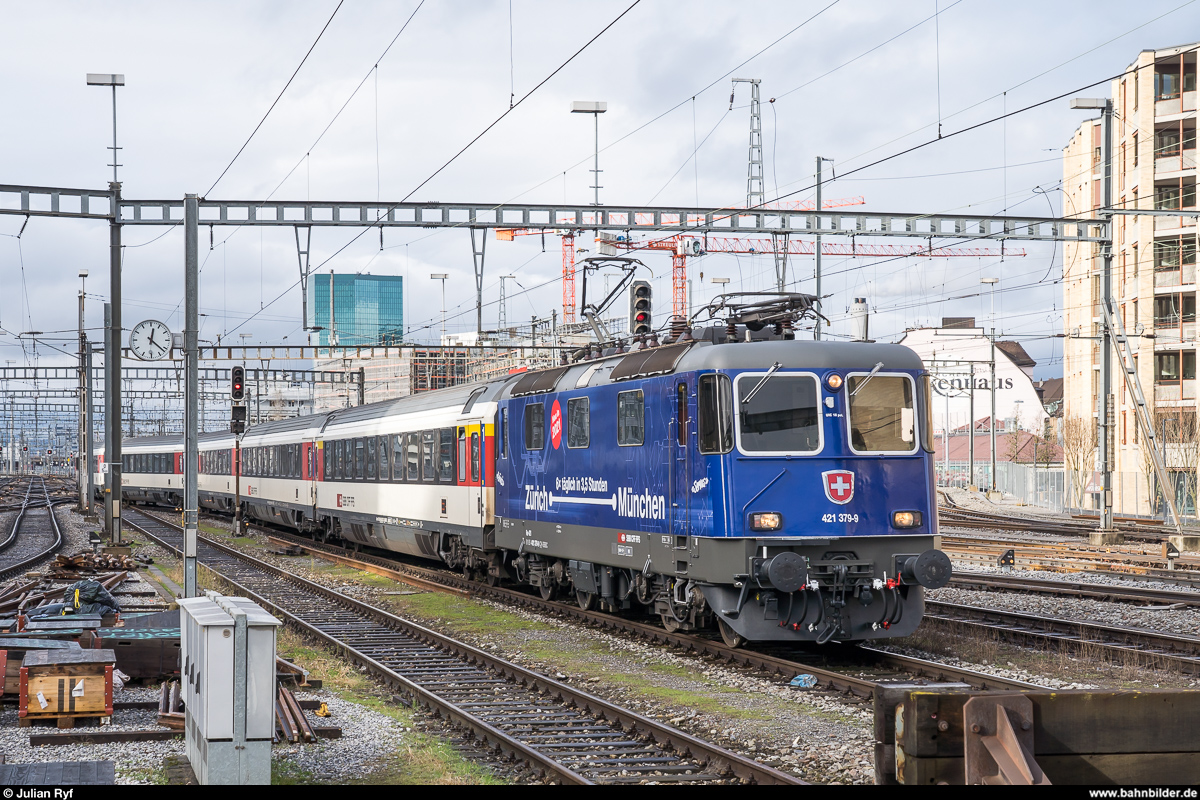 Die neuste Werbelok, die an SBB Personenverkehr langzeitvermietete SBB Cargo Re 421 379, macht seit neustem Werbung für die ab nächstem Fahrplanwechsel schnellere elektrische Bahnverbindung zwischen Zürich und München. Am 21. Dezember 2019 war sie auf dem IC 4 zwischen Zürich und Singen unterwegs und erreicht hier gerade Zürich HB.