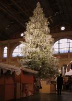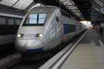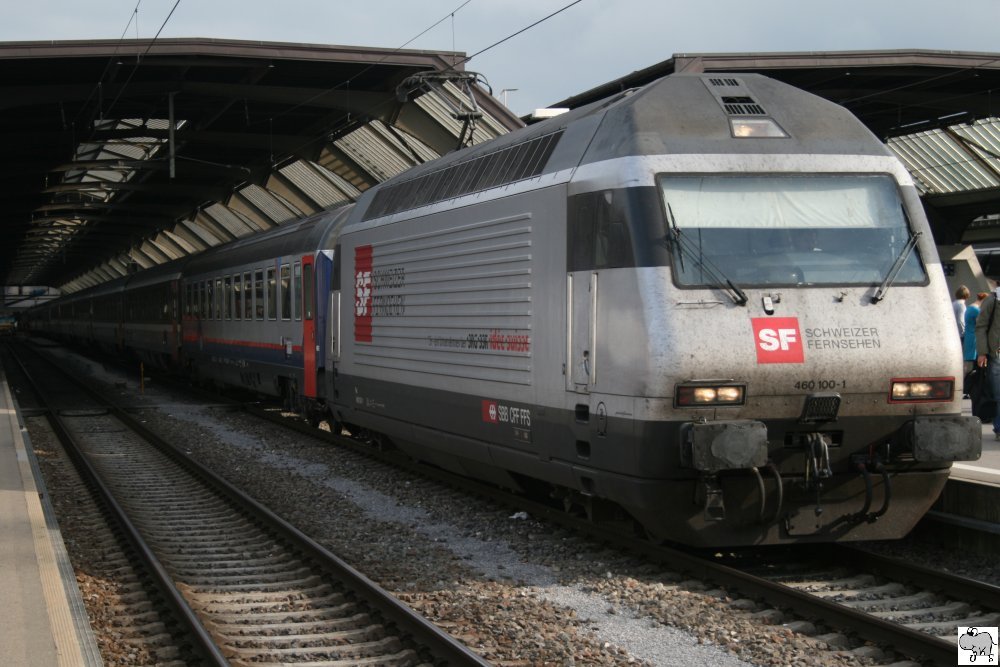 Die mit Werbung für das Schweizer Fernsehen fahrende 460 100-1 steht am 9. Oktober 2009 an der Spitze eines Personenzuges im Bahnhof Zürich.