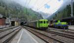 Zweierlei Autoverlad-Steuerwagen der BLS, denen der Tunnelbetrieb deutlich anzusehen ist. Während der Zug links den Bahnhof Kandersteg gerade erreicht hat, fährt der Zug rechts gerade ab in Richtung Lötschberg - Goppenstein. Die Steuerwagen bieten Platz für Motor- und Fahrräder. Sie besitzen eigene Pantographen für die Heizung.