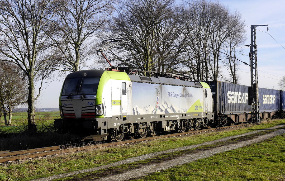 Auch ein Alpinist schlich durch das weite Land am linken Niederrhein: BLS-Cargo-Vectron 407 auf Umleiterfahrt bei Boisheim, 19.1.19.