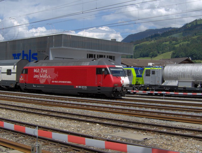 Extrazug Brig-Bern bestehend aus zwölf EW III Wagen bei der Einfahrt im Bahnhof Frutigen."Stosslok" war die Re 465 014. 16.6.2007