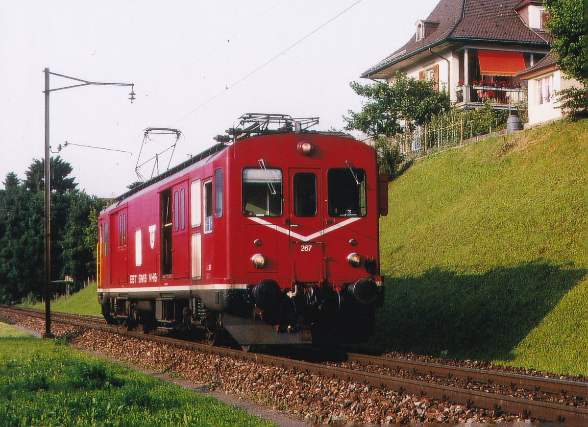 Der RM-De 586 258-6 (ex VHB 266) wartet am 7. Februar 2003 in Solothurn mit dem AB 409 auf seinen nächsten Einsatz (Fotostandort auf dem Perron).
