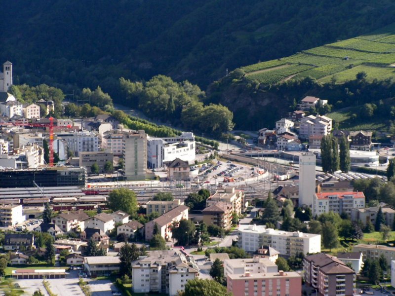Blick auf den Bahnhof von Visp mit der Abzweigung der MGB Bahn nach Zermatt von der Lötschbergsüdrampe aus gesehen. 03.08.07